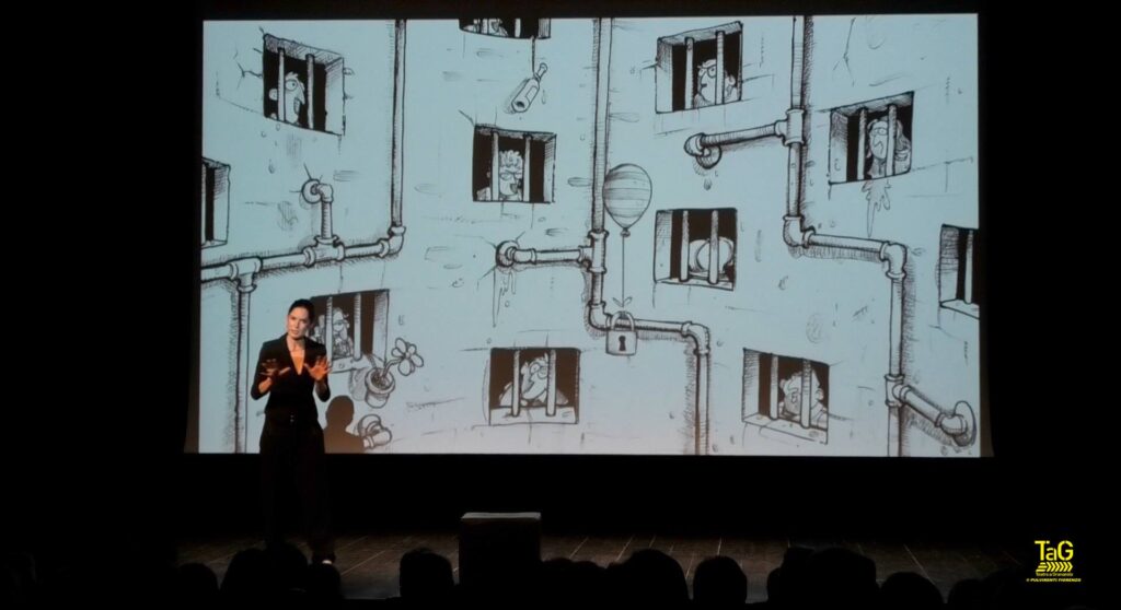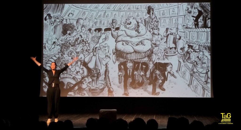 I talents show, la grande distribuzione, la filosofia del contatto giusto e molto altro di brutto raccontato da Arianna Porcelli Safonov e dalle video-tavole di Steve Magnani che interagiscono con la scena e giocano a ricordare le opere di Gustavo Dorè coi gironi infernali.